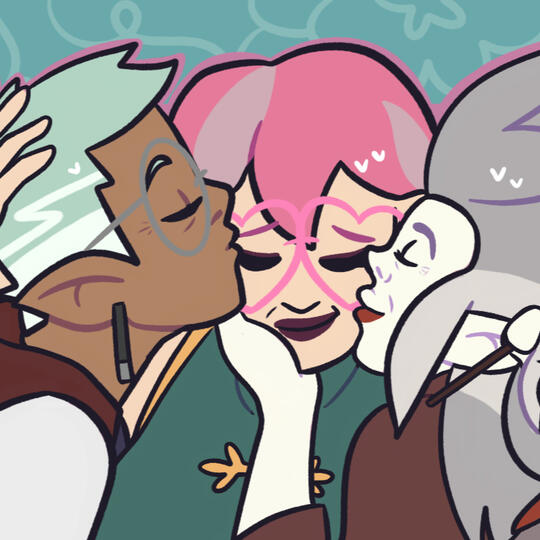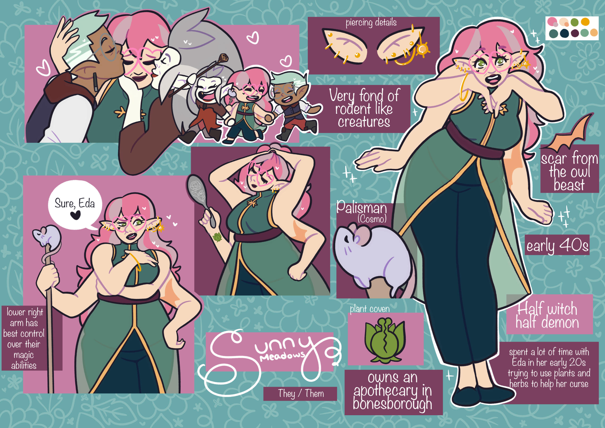 Sharing SelectiveMain romantic interests are Eda & RaineSunny spent a lot of time with Eda and Raine when they were all in their 20s. They are an apothecary trained in plant magic & is/was part of the plant guild.Sunny tried to work with Eda when she was first cursed to try and create a salve or balm that would help take away the curse that she had been afflicted with, to no avail.Sunny still lives in Bonesbourough and keeps an eye on Eda from afar. the trio reunites and they find that the spark from when they were in their twenties is still alive.