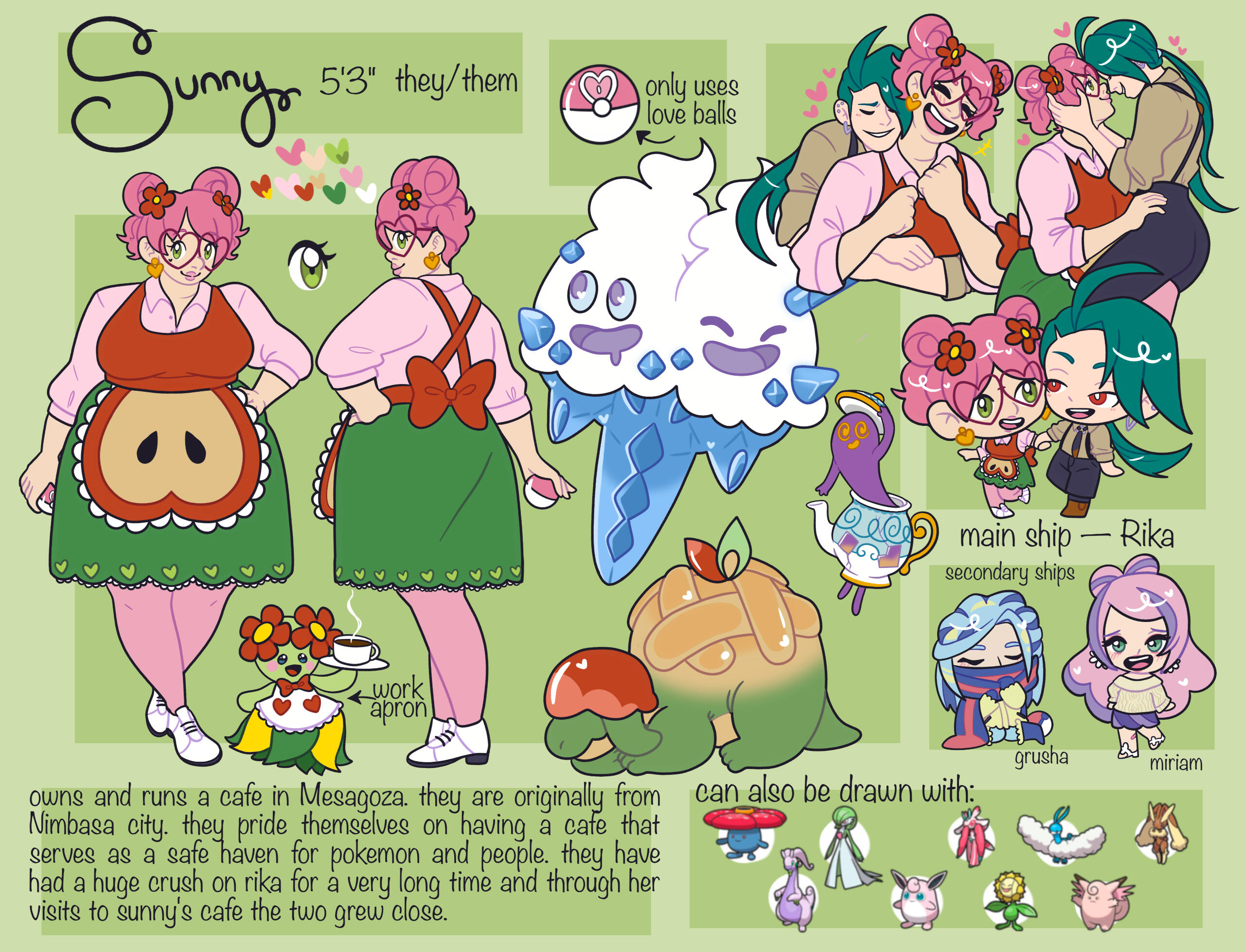 However irl Sunny also loves Miriam, Grusha, Piers, and Guzma, so they may appear from time to time.Sunny owns a cafe in Mesagoza, Paldea. They run the cafe with the help of their partner Pokemon. Sunny does not have a preference for battling and all of the partner Pokemon are free to come and go as they like from the cafe, though the majority of them have very strong bonds with Sunny and enjoy having a warm safe place to live and the homecooked meals from Sunny.Sunny is originally from Nimbasa City in Unova, their Oddish & Vanillite (now Bellossom (Rosemary) & Vanilluxe (Vanilla)) the only Pokemon that emigrated with them.